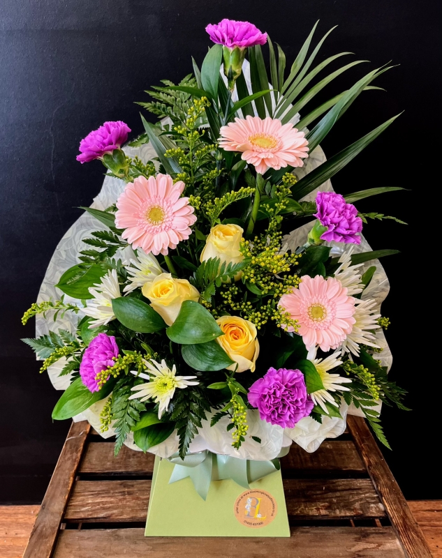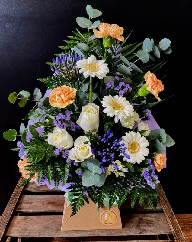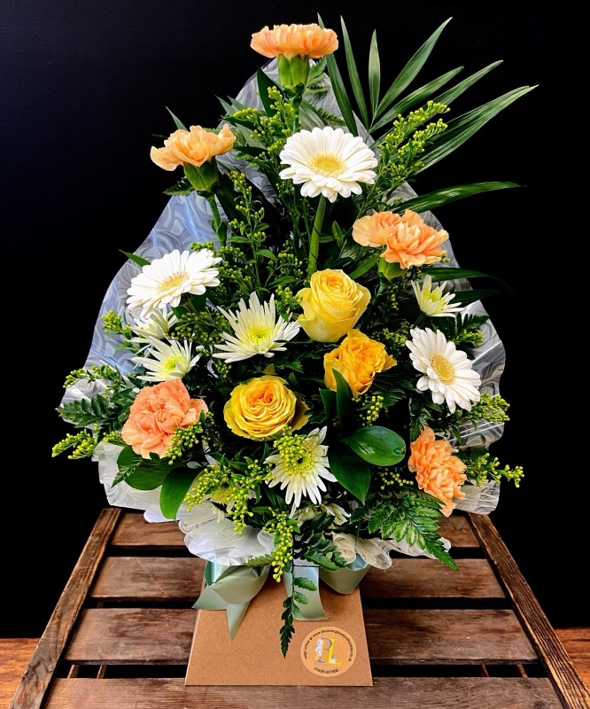 A stunning array of seasonal flowers, carefully arranged into a triangular arrangement, perfect for all occasions and sure to impress!